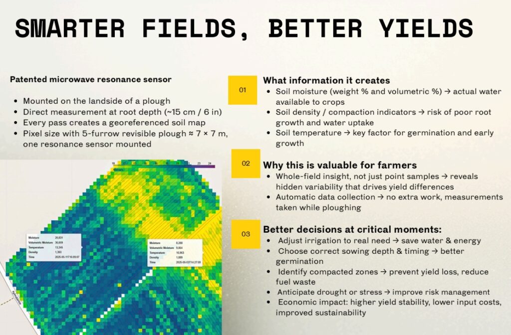 Yritysten yhdessä kehittämä teknologia tuottaa luotettavaa maan kosteus-, lämpötila- ja tiheystietoa suoraan juuristosyvyydeltä normaalien peltotöiden yhteydessä. Sitä voidaan hyödyntää esimerkiksi kynnön, maanmuokkauksen, kylvön sekä sadetuksen ohjauksen yhteydessä, jolloin viljelijä saa paremmat edellytykset tehdä oikea-aikaisia ja taloudellisesti hyödyllisiä päätöksiä.
