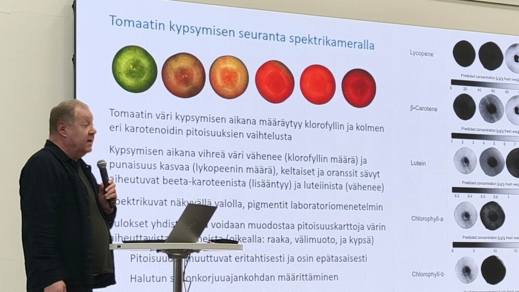 Spektrikuvantaminen nousi keskeiseksi teknologiaksi, koska se pystyy tunnistamaan raaka-aineiden koostumuksen, kypsyyden, vauriot ja kosteuden sadoista kapeista aallonpituuskaistoista. Spektrikuvantaminen on eräänlainen “valon röntgen”: se havaitsee asioita, joita tavallinen kamera ei näe. Sen avulla voidaan tunnistaa esimerkiksi home- ja mikrobivaurioita, vesipitoisuuksia, rasvan tai proteiinin määriä, hedelmien kypsyysastetta ja jopa huonot siemenet siemenvirrasta. Itä-Suomen yliopisto ja Specim esittivät runsaasti käytännön esimerkkejä siemenistä, hedelmistä, lihasta ja pakkausmateriaaleista – kaikki kohteita, joissa spektri voidaan kytkeä automaattiseen lajitteluun tai prosessiohjaukseen. Spektri ei siis ole kuva, vaan mitta, jonka tuottamat päätökset ovat objektiivisia ja toistettavia.